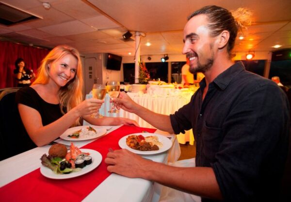 Navegando por el pintoresco puerto de Benoa, te sumergirás en un ambiente de lujo y confort. Una vez que el sol se despida, la diversión continúa con una variedad de entretenimiento en vivo. Desde música en directo hasta actuaciones de cabaret y sets de DJ, la noche estará llena de ritmo y energía.
